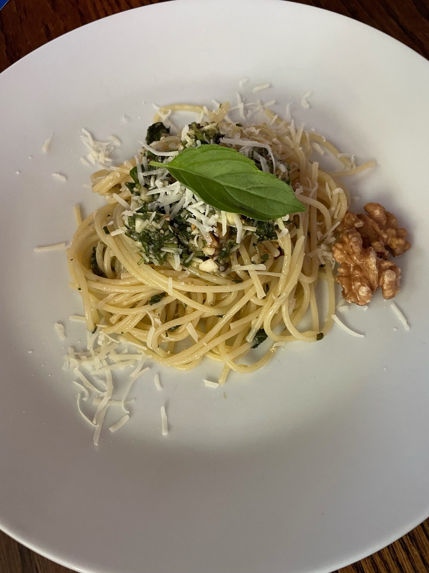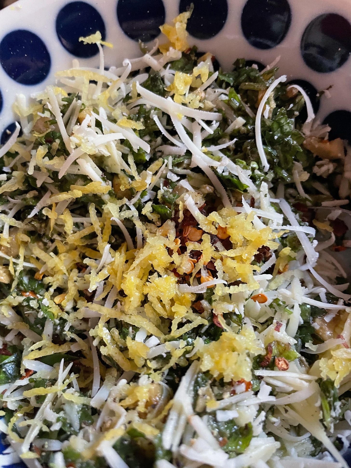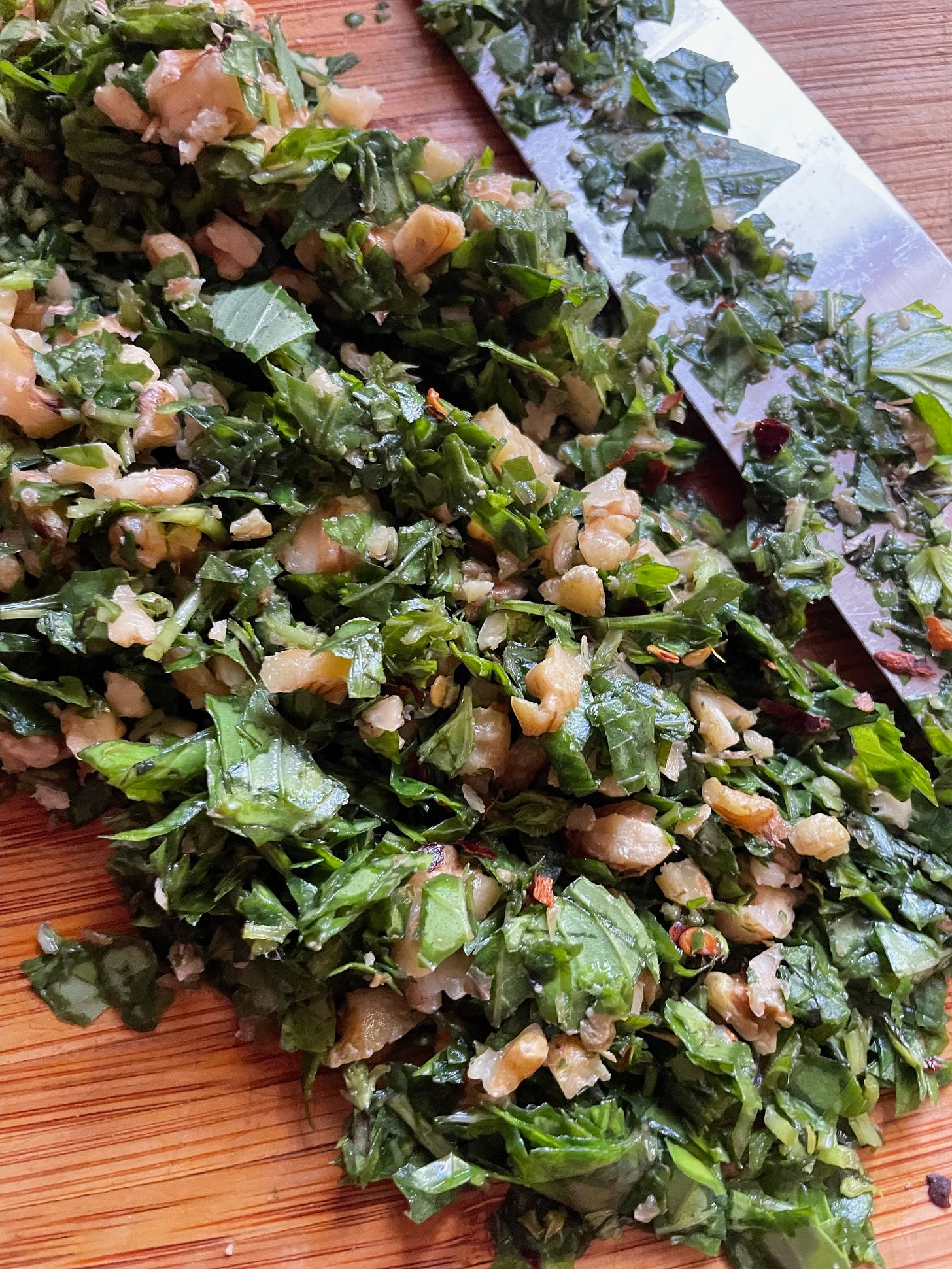I started by chopping the basil, back and forth back and forth at an angle with a sharp knife until it was fully minced, added in garlic, and walnuts, did the same until it was totally minced (You can use a immersion blender for this process or a teenytiny blender. In my experience a full sized blender is a bit of a headache as the nuts and leaves tend to get stuck.) Then I chucked it in a bowl, grated a lemon’s rind into it, (just the rind, no pith) and added a quarter teaspoon of pepperoncino and the cheese. Mixed it all up and it was ready!