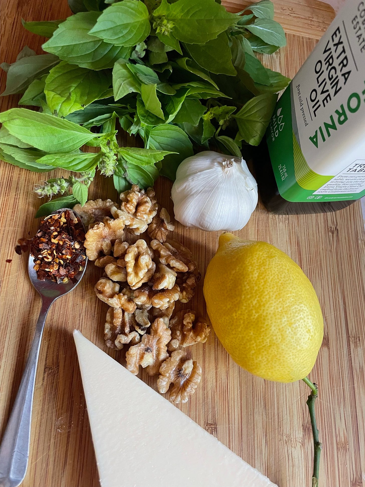Fast forward to California, and a variety of fresh nuts, and basil year round, it is beyond delicious. You CAN use pine nuts but I find them very pricey, and I’ve now gotten accustomed to the toasty taste of pecan in our pesto. it is a variable thing. Today, I’m using walnuts because…too lazy to go buy more pecans. We also get a lot of Armenian lemon basil in our neighborhood, so that affects the flavor. The most important thing is really good olive oil.